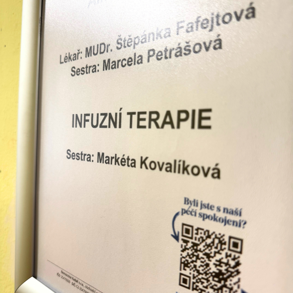 Infuzní terapie zahájila provoz v roce 2022 a od té doby jejich služeb využilo velké množství pacientů. Celý chod ordinace zajišťuje všeobecná sestra Markéta Kovalíková, která je pacientům k dispozici od úterý do pátku od 10:00 do 14:30 hodin.
