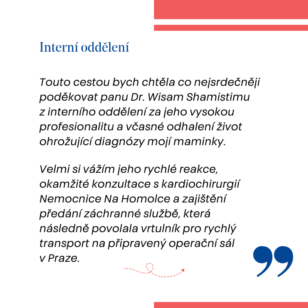 DÍKY ODBORNOSTI, ROZHODNOSTI A LIDSKÉMU PŘÍSTUPU BYLA POSKYTNUTA NAŠÍ PACIENTCE VČASNÁ PÉČE, KTERÁ JÍ ZACHRÁNILA ŽIVOT.