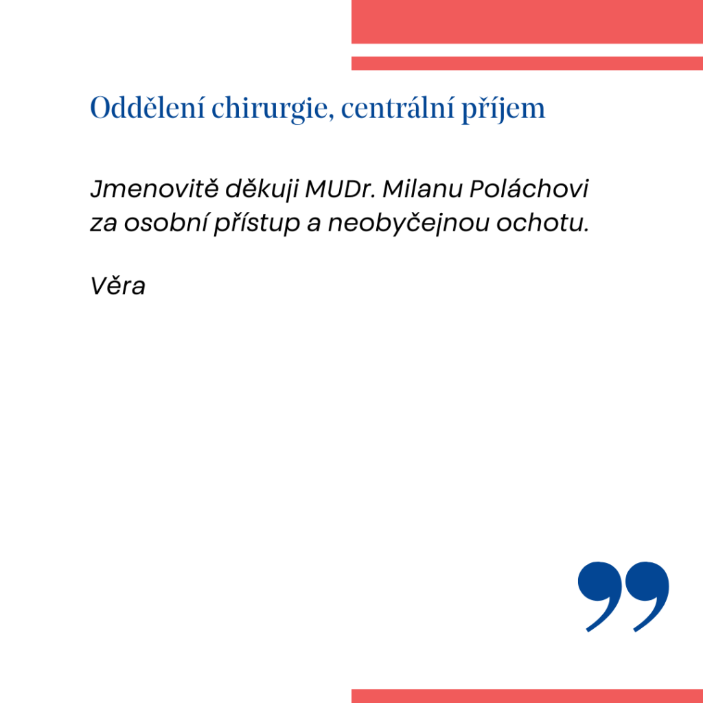 DĚKUJEME PANÍ VĚŘE ZA KRÁSNOU POCHVALU PRO ODDĚLENÍ CHIRURGIE A CENTRÁLNÍ PŘÍJEM A PŘEJEME HLAVNĚ HODNĚ ZDRAVÍ!